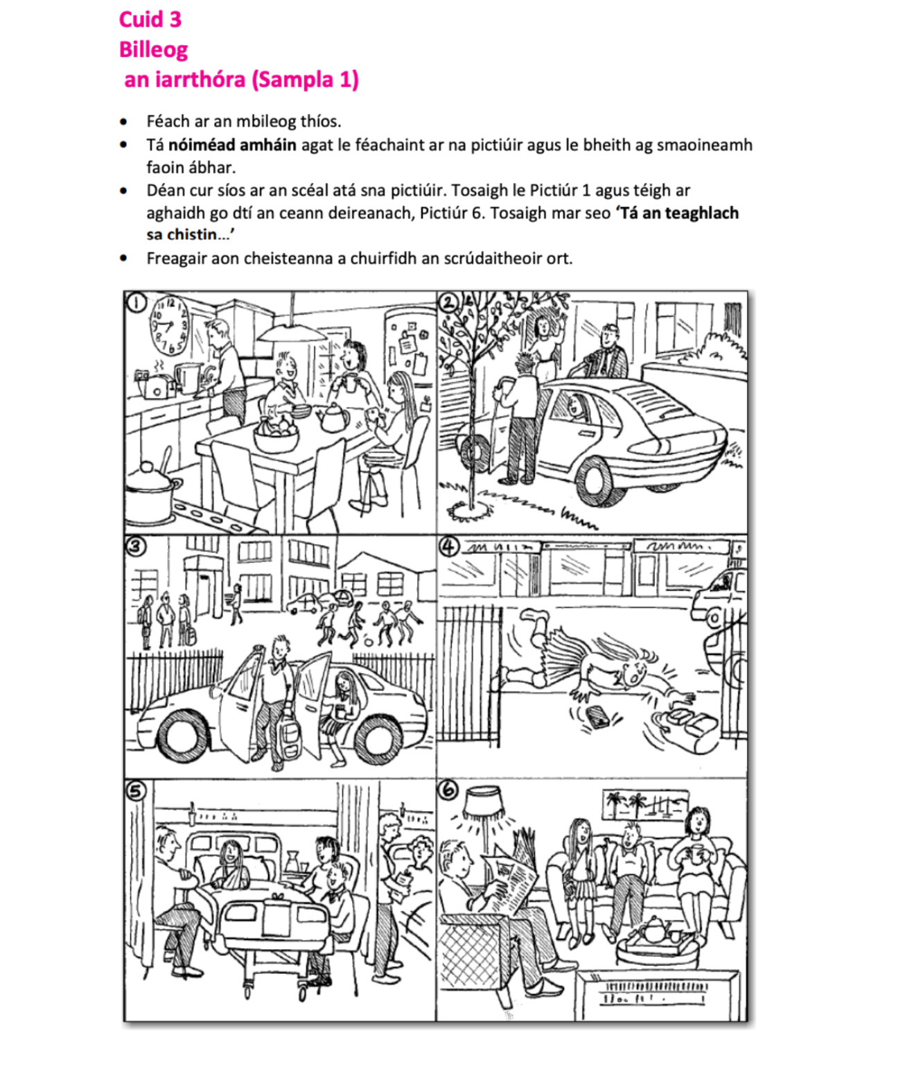 - Sraith Pictiúr (Picture Sequence): In this part, you’ll describe a set of pictures, telling the story they depict. This also lasts 3-4 minutes.